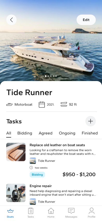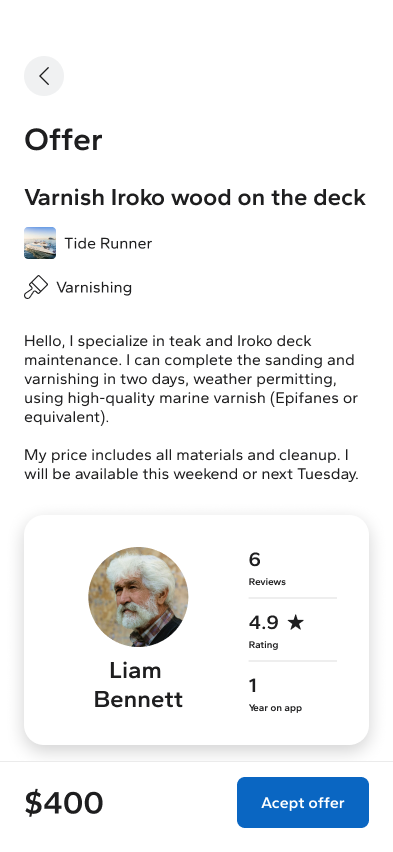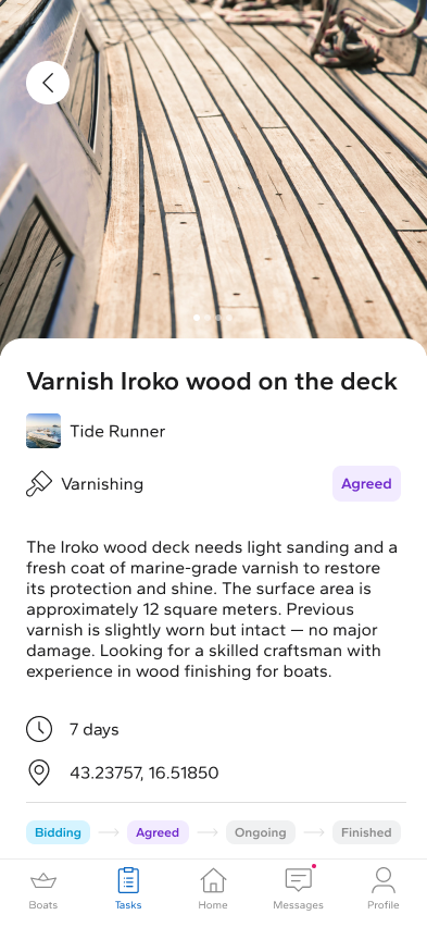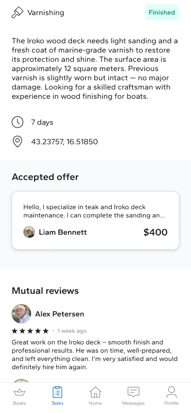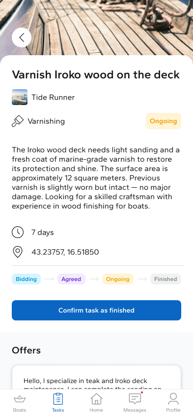 The platform is structured around a task-based workflow. Boat owners post a job without setting a budget, reducing decision fatigue and encouraging more accurate, market-driven offers. Craftsmen browse available tasks and submit bids, clearly communicating pricing and availability. The interface prioritizes clarity, trust, and easy comparison, allowing boat owners to review offers efficiently and select the most suitable professional.