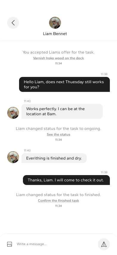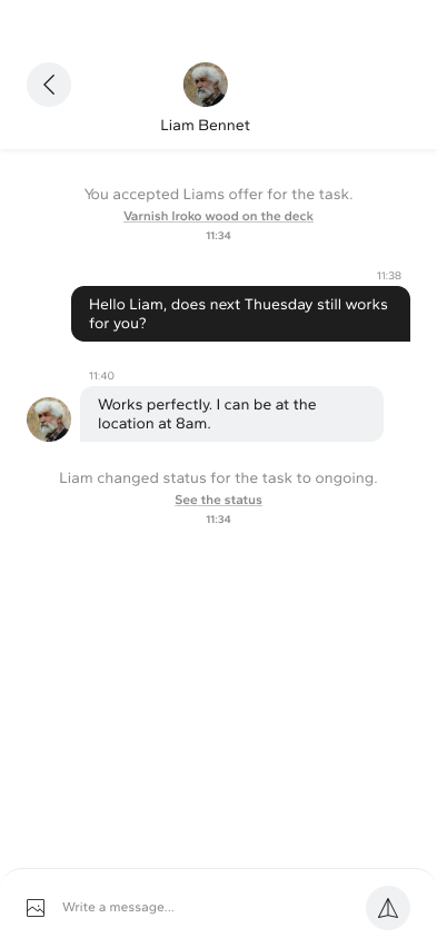 By embedding task status changes directly into the conversation, the design reinforces transparency and trust between users. Both parties always know the current state of the task and required next steps, from agreement to completion and review.