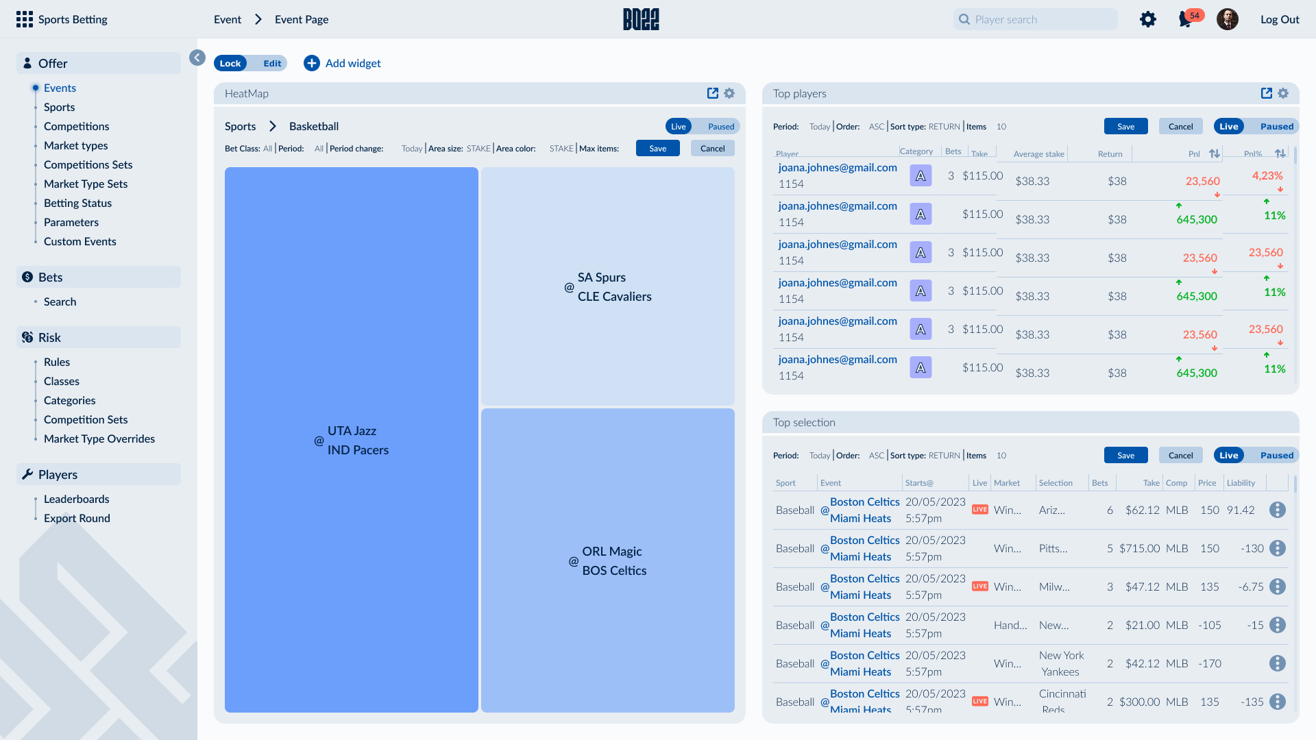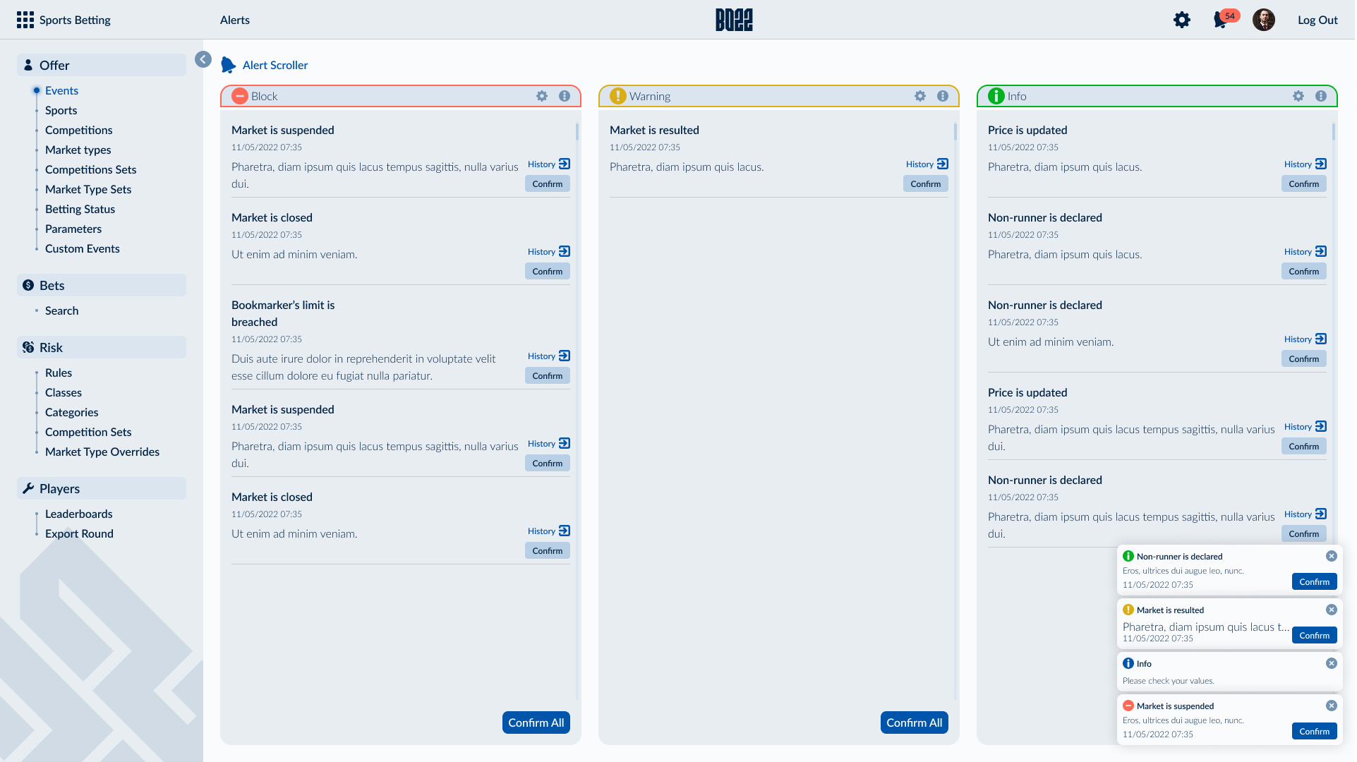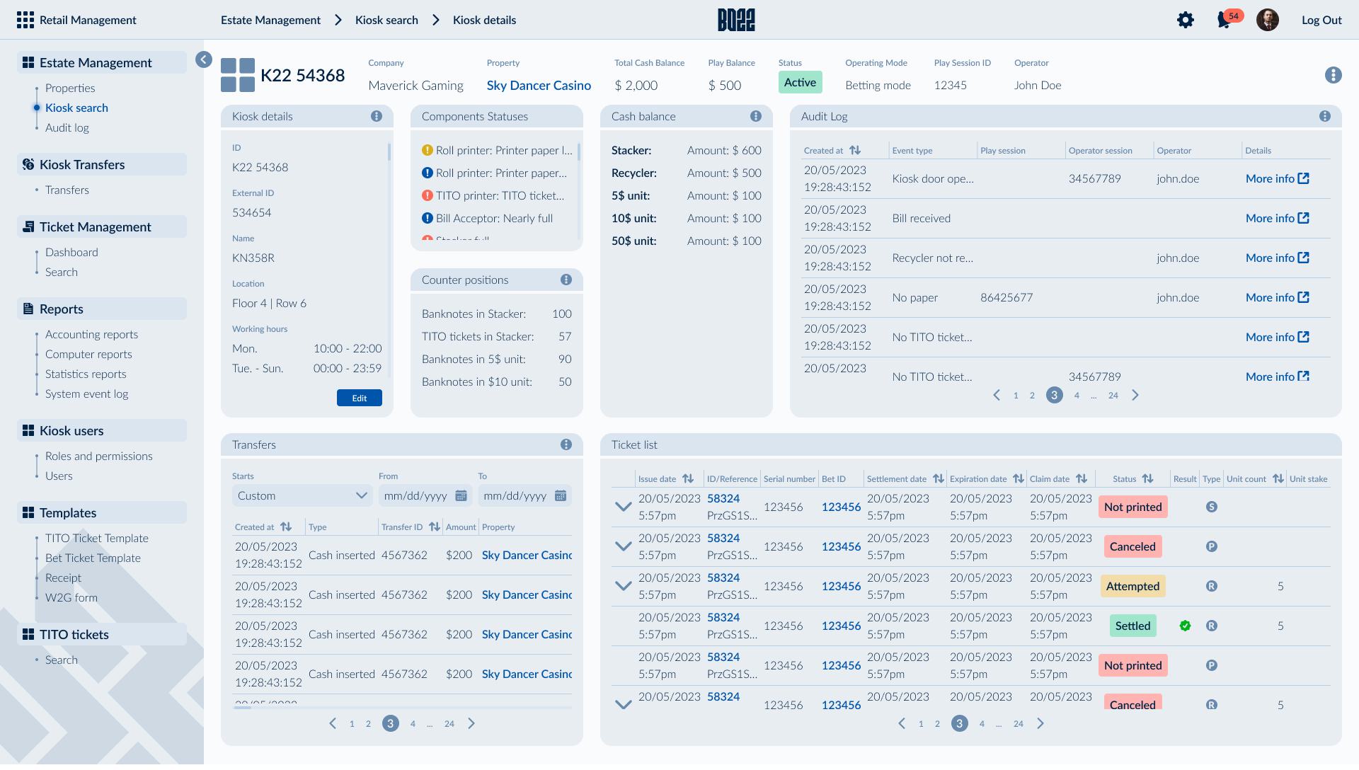 The backoffice supports the full operational scope of the SB22 ecosystem through eight interconnected modules. Due to the platform’s complexity, a structured side navigation was designed to provide clear orientation across modules and sub-flows. Data-heavy content is organized into modular widgets, allowing operators to customize views, monitor key metrics efficiently, and manage complex tasks with clarity and control.