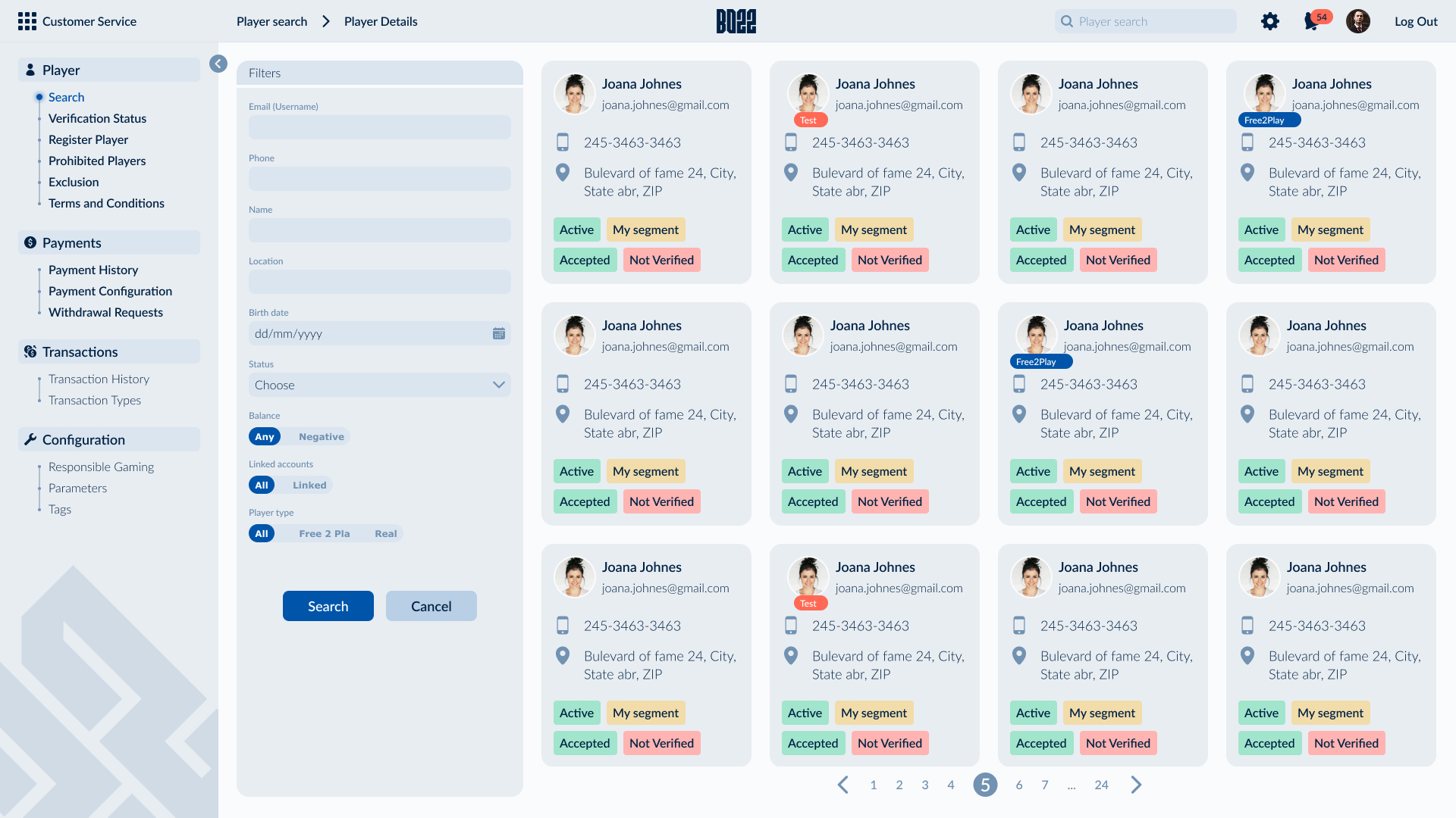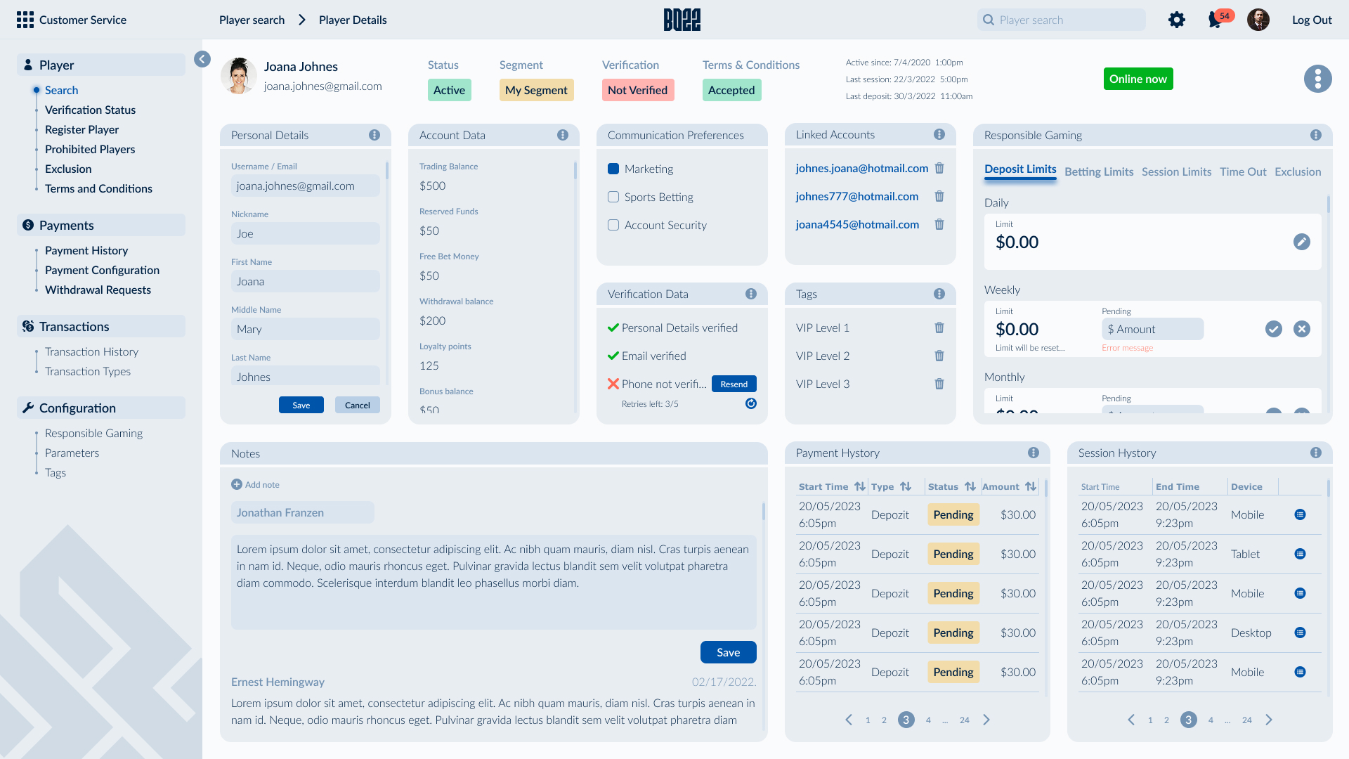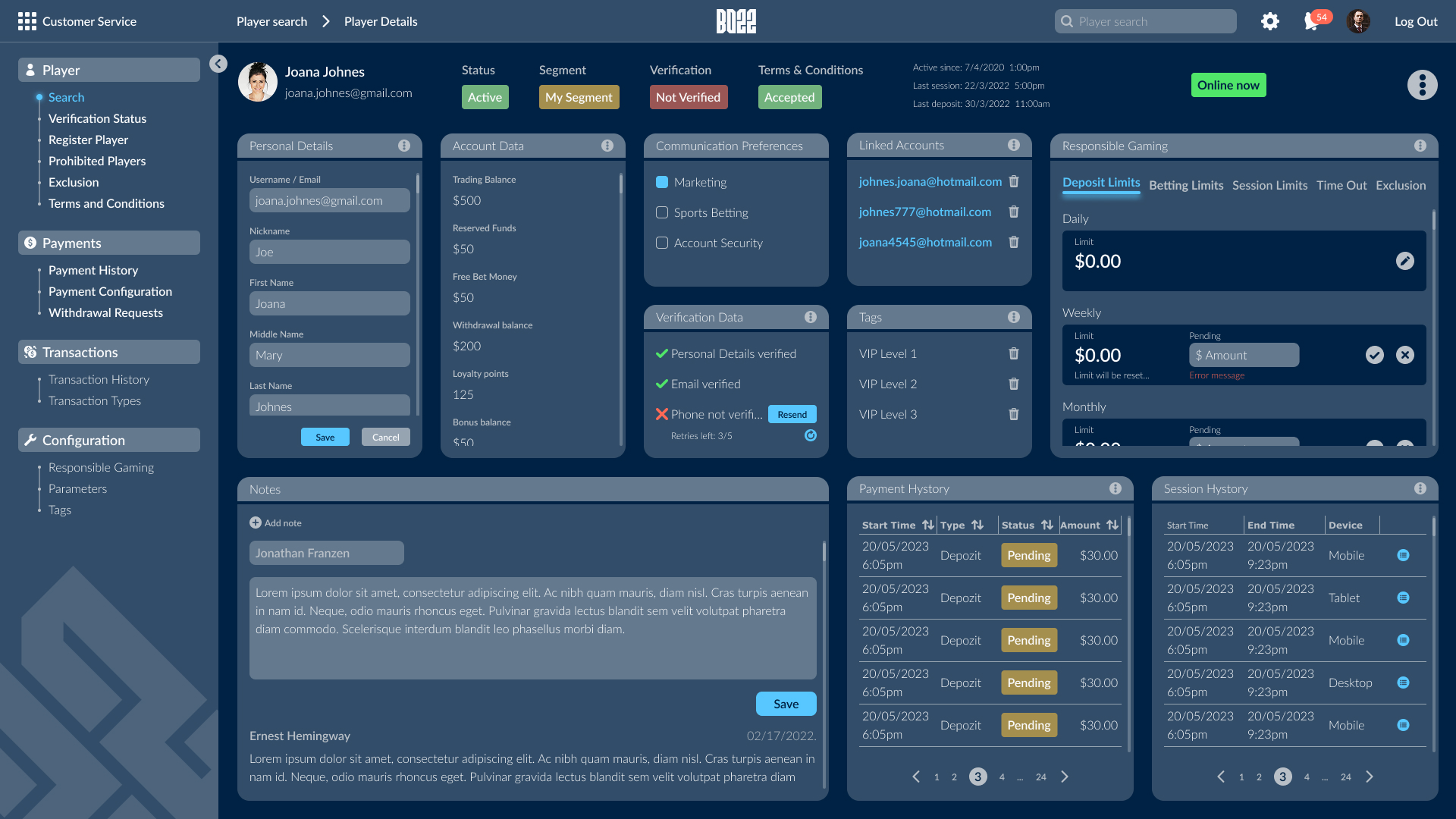 The backoffice supports the full operational scope of the SB22 ecosystem through eight interconnected modules. Due to the platform’s complexity, a structured side navigation was designed to provide clear orientation across modules and sub-flows. Data-heavy content is organized into modular widgets, allowing operators to customize views, monitor key metrics efficiently, and manage complex tasks with clarity and control.